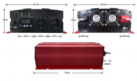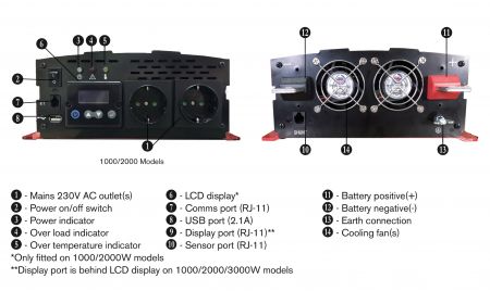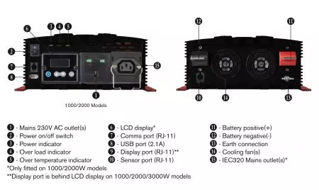 230VACコンセント×2。このPSWシリーズ正弦波パワーインバータは、出力電圧、前回のエラーコード、バッテリー、省電力モード、低電圧ロックアウト、出力周波数の設定をLCDディスプレイで表示します。LCDディスプレイがない場合は、Bluetoothアプリで確認できます。